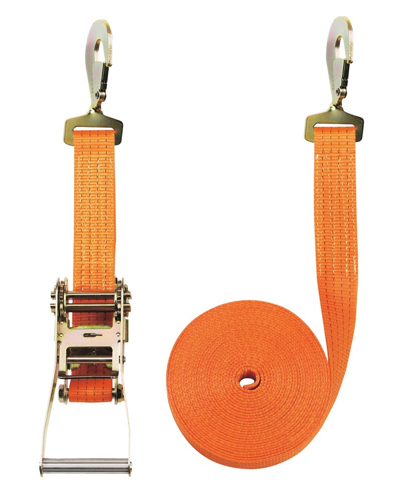 Zweiteiliger Zurrgurt, mit gedr. Karabinerhaken, 4000 daN zul. Zugkraft in der Umr., Gurtbr. 50 mm, Länge 6 m, Farbe orange, 4 Streifen, VE 2 Stück