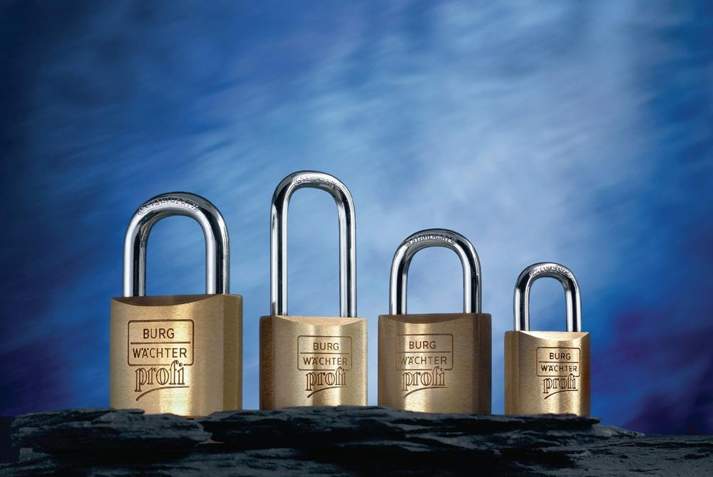 massiver Messingkörper · Bügel stahlhart · doppelt verriegelt · Präzisions-Schließwerk mit 2 Schlüsseln · hohe Anzahl verschiedener Schließungen · Innenwerk rostfrei · millionenfach bewährte Qualität · Hergestellt in Deutschland